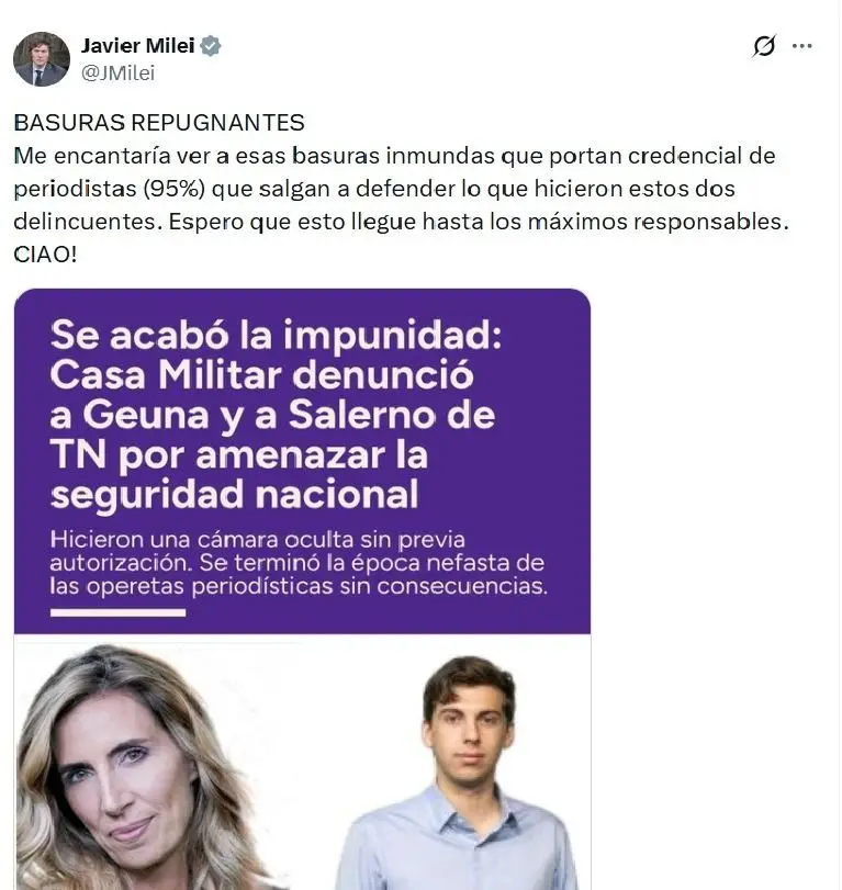 Lejos de buscar conciliar, Milei reivindicó la acción a través de su cuenta de X. “BASURAS REPUGNANTES Me encantaría ver a esas basuras inmundas que portan credencial de periodistas (95%) que salgan a defender lo que hicieron estos dos delincuentes. Espero que esto llegue hasta los máximos responsables”, afirmó, apelando a las mayúsculas.