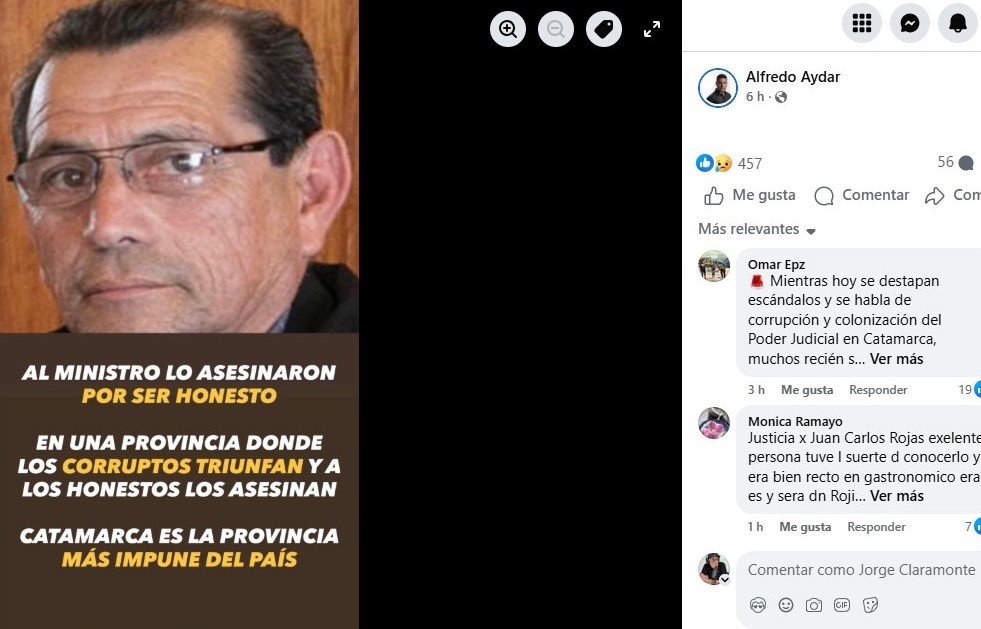En otro posteo, acompañado por la imagen del ministro asesinado Rojas, escribió: “Al ministro lo asesinaron por ser honesto, en una provincia donde los corruptos triunfan y a los honestos los asesinan. Catamarca es la provincia más impune del país”.