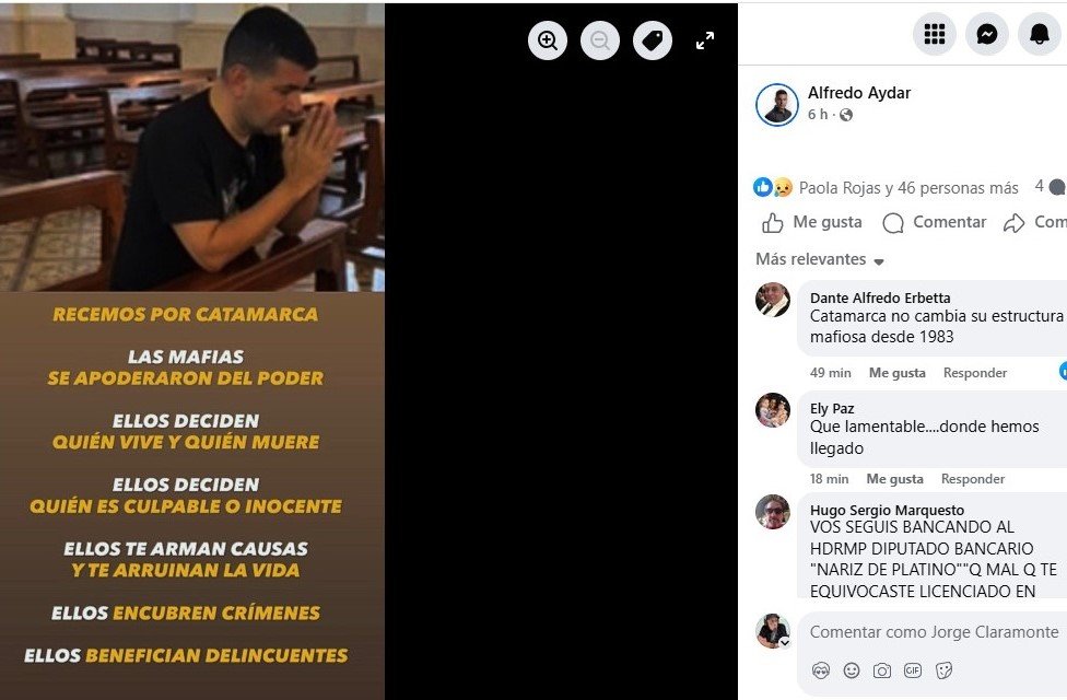También, con una foto donde se lo ve a él mismo rezando en una iglesia, escribió: “Recemos por Catamarca. Las mafias se apoderaron del poder. Ellos deciden quién vive y quién muere. Ellos deciden quién es culpable o inocente. Ellos te arman causas y te arruinan la vida. Ellos encubren crímenes. Ellos benefician delincuentes”.