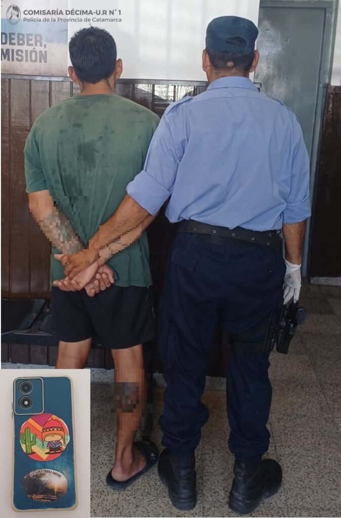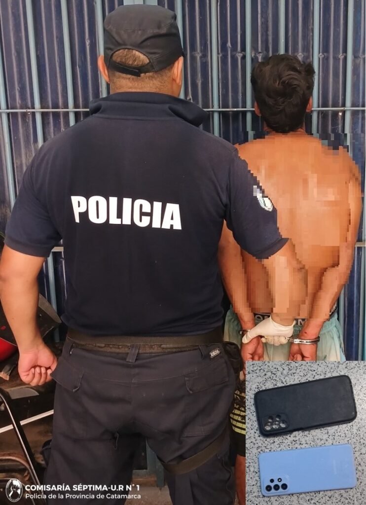 De inmediato y con las características brindadas, los uniformados ampliaron el recorrido por la zona y, en la esquina de calles La Rioja y Armando Correa, aprehendieron al supuesto autor del ilícito, un hombre de apellido Zalazar (30), a quien al momento de realizarle un palpado superficial, le encontraron entre sus pertenencias el aparato de comunicación sustraído y el Documento Nacional de Identidad de la damnificada, que fueron recuperados y quedaron en calidad de secuestro.