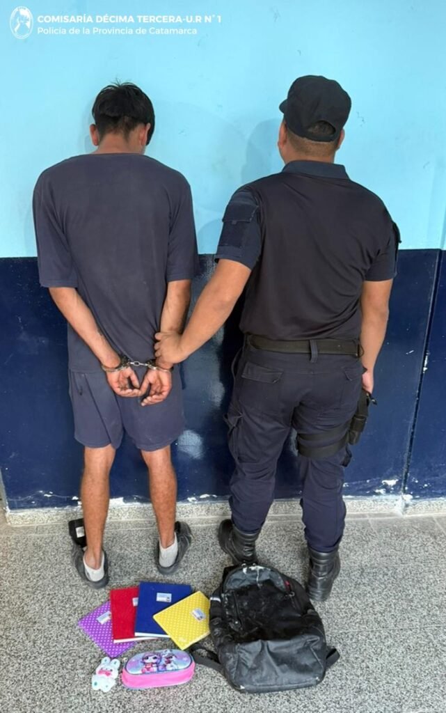 De inmediato y en cercanías del lugar, los Policías procedieron a la aprehensión de un sujeto de apellido Peschiutta (26), quien habría sido sorprendido llevando una (01) mochila que contenía útiles escolares, que quedaron en calidad de secuestro.