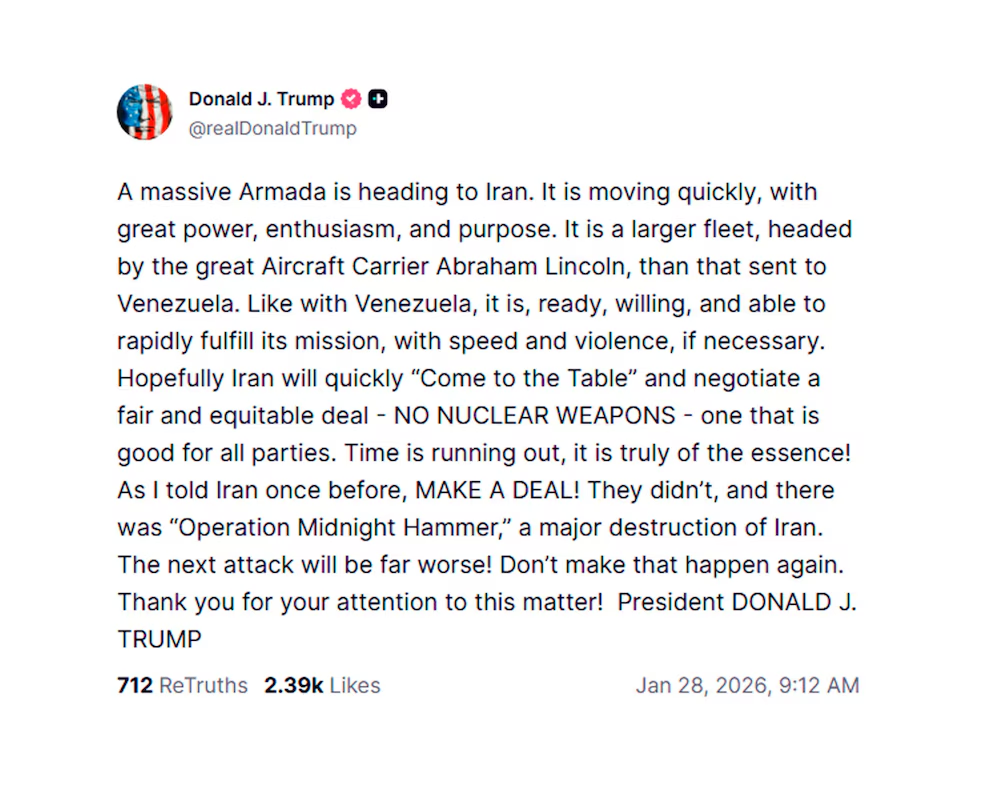 El despliegue militar estadounidense se produce después de que el Comando Central de Estados Unidos (Centcom) confirmara la presencia del portaaviones USS Abraham Lincoln y su grupo de combate en Oriente Medio, tras el anuncio de Trump y en respuesta a la represión de las protestas en Irán. Aunque las manifestaciones más intensas ocurrieron los días ocho y nueve de enero y han sido sofocadas, Trump decidió mantener la orden de envío de la flota.
