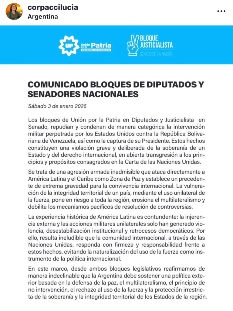 “El verdadero interés no son la libertad ni los derechos humanos: les interesa el negocio, la energía y el control geopolítico”, consideró Iramaín, y que “la detención de Maduro y su esposa no es un hecho aislado, sino parte de una estrategia histórica de sanciones, bloqueos, operaciones y golpes encubiertos que siempre terminan pagando los pueblos”. “América Latina no necesita tutelaje, necesita respeto. Basta de golpes, de injerencia extranjera y de decidir desde Washington el destino de países soberanos”, concluyó Iramaín.
