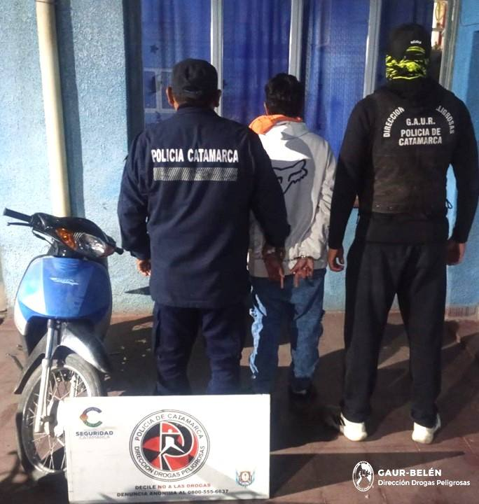 En inmediaciones a la playa de estacionamiento de un establecimiento escolar ubicado en la Avenida de Circunvalación S/N°, de la ciudad de Belén, numerarios del Grupo Antinarcóticos de Unidades Regionales cumplimentaron una orden de requisa personal e identificaron a un joven de 23 años de edad.