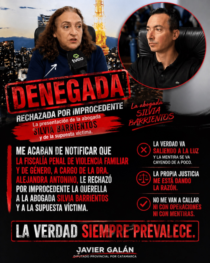 La abogada Barrientos comentó: “Estamos ajustando detalles, estamos reuniendo todas las pruebas, porque cuando denunciamos y nos presentamos con una nueva víctima, como pensamos hacerlo también, queremos que sea impecable todo lo que presentamos, como lo hemos hecho hasta hoy. Aprovecho esta nota para para decirles que me sorprende muchísimo lo que me he estado enterando hoy a través de las redes, donde Galán publicó que fui denegada, querella denegada, con rojo. Obviamente, ese collage que se hizo hacer, lo voy a usar como prueba. Prueba de su perfil patológico, psicopático, que habla de cómo miente y confunde a la población. Primero y principal, no hay ninguna querella denegada. Cuando nosotros nos presentamos como denunciantes presentamos una querella. Pero el primer día de presentación de la querella se nos dijo, esto va a quedar acá, en stand by, hasta que se proceda con la investigación y con el desafuero”.
