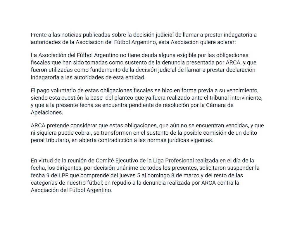 Según pudo reconstruir Infobae, durante el encuentro Gustavo Lorenzo, director general de la AFA, presentó una captura de la página oficial de ARCA que, de acuerdo con sus palabras, demuestra que la AFA no registra deudas ni tiene declaraciones juradas pendientes. Con ese documento, los directivos plantearon que la deuda que motivó la causa judicial no existe. La exhibición de ese material resultó determinante para la postura de los clubes: la dirigencia de Primera resolvió impulsar el paro como señal de respaldo institucional.