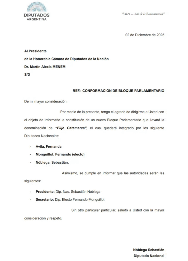 Los diputados Fernanda Ávila, Sebastián Nóblega y el electo Fernando Monguillot, que responden a al peronista Jalil, firmaron la carta enviada al presidente de la Cámara baja, Martín Menem. Allí, se indica que el segundo de los nombrados asumirá la presidencia de esa nueva bancada.