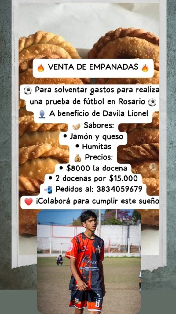 En tiempos donde el esfuerzo y la solidaridad se vuelven fundamentales, una iniciativa comunitaria busca darle impulso al sueño de un joven futbolista catamarqueño. Se trata de una venta de empanadas organizada a beneficio de Lionel Dávila, quien necesita recaudar fondos para poder viajar a Rosario y realizar una prueba futbolística.