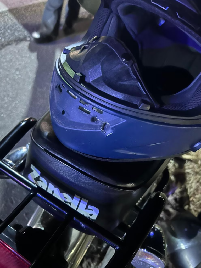 El policía detuvo la moto unos metros más adelante y se sacó un casco. Fue este elemento de seguridad el que le salvó la vida: los rapiñeros llegaron a dispararle y la bala dio en el casco, informó el noticiero Telemundo de Canal 12.